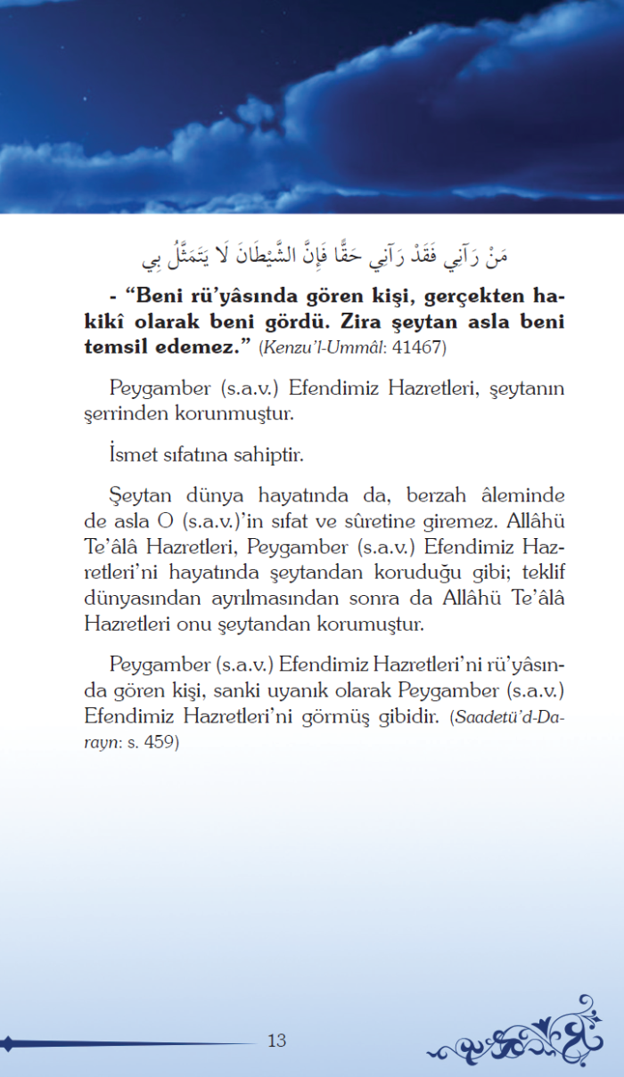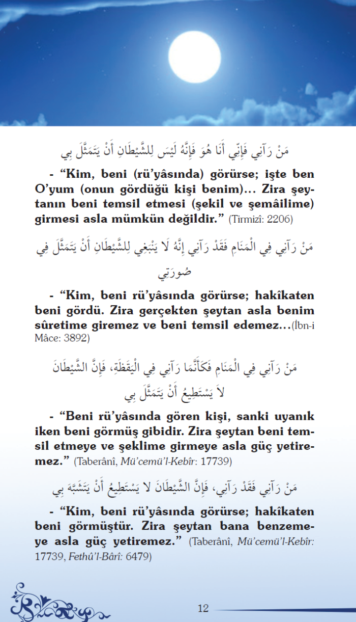 Yayınevimizin kurucusu muhterem Üstadımız Ömer Muhammed Öztürk de bizleri; hâlleri, sözleri ve eserleriyle her hususta Sünnet-i Seniyye’ye kılavuzlamışlar, elinizdeki “Resûlullah (s.a.v.) Efendimiz’i Rüyada Nasıl Görebiliriz?” isimli eserin yayınlanmasını işaret ederek, Resûl-i Ekrem (s.a.v.) Efendimiz’in cemâl-i bâ kemâliyle müşerref olmamıza vesîle olacak dua, ibadet ve tavsiyeleri istifademize sunmuşlardır. Kendilerine şükran ve minnetlerimizi arz ederiz.